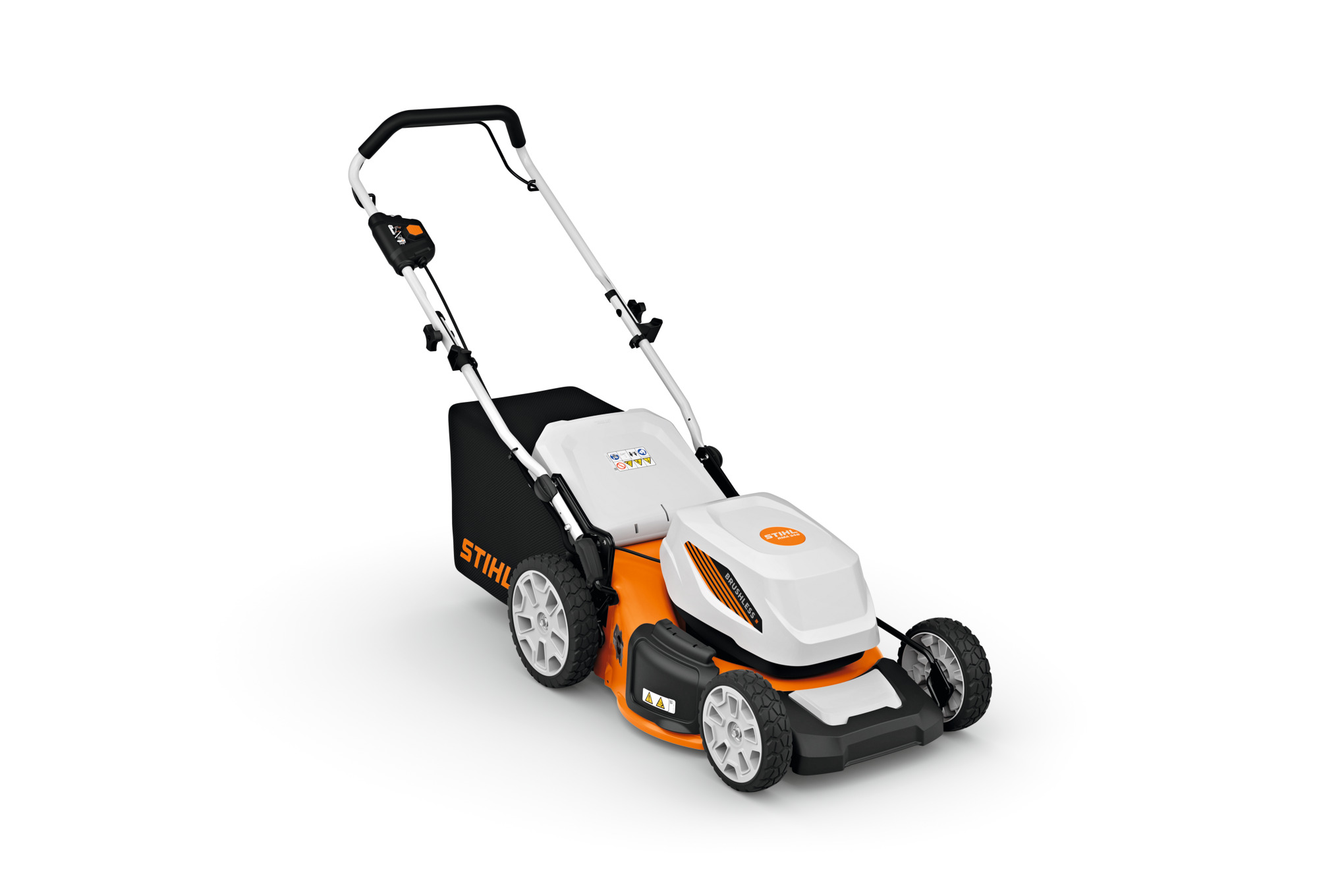 The STIHL RMA 348 has a robust sheet steel housing and central cutting height adjustment, which allows you to choose the desired cutting height in 7 settings from 25 mm to 100 mm. The textile grass catcher box with 60-litre volume is easy to empty. Thanks to the folding handlebar, you can store the battery mower compactly and transport it effortlessly.